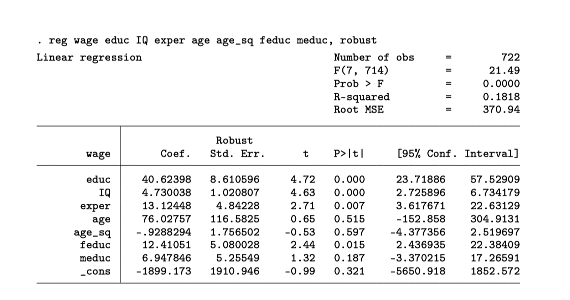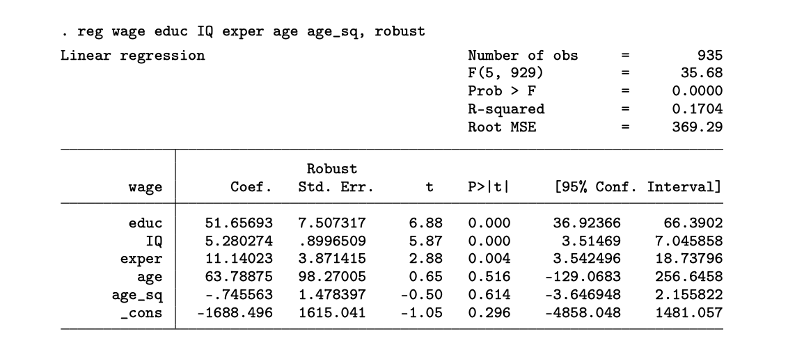 \[wage_i = \beta_0 + \beta_1 educ_i + \beta_2 IQ_i + \beta_3 exper_i + \beta_4 age_i + \beta_5 age_i^2 + u_i\]
